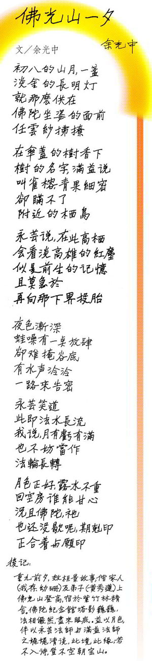 上佛光山登高,宿於紫竹林精舍。佛陀紀念舘塔影巍巍,法相儼然,盡來眼底。益以月色,伴以永芸法師與滿益法師之娓娓清談,此境此緣,若不入詩,豈不空朝寳山。