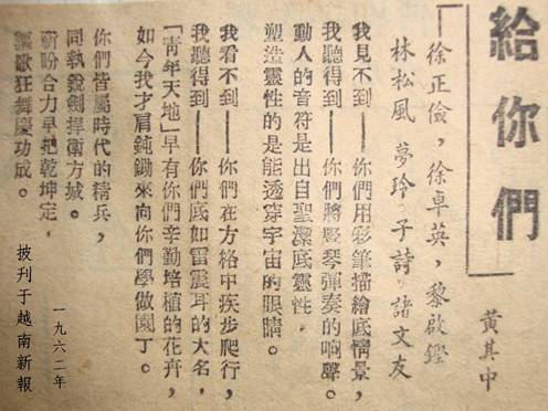 每當誦讀到這首詞賦,古今多少事,都在此刻齊湧上心頭,中國歴代皇朝的興衰起落,自古至今,遷變無窮,所謂「古人不見今時月,今月曾經照古人」,且看長江黃河之水,千萬年後依舊長流,天上日月星辰,千萬年後依然光朗普照,不斷在改變的,是誰掌握着江山,換了幾許風雲人物,越南的歷史何嘗不是如懸壁的畫絹,一幅摘下另一幅又掛起!越南的華文文學,現代詩及文藝,也隨著懸壁的畫絹替換,要追究華文文學的史畧,又怎能不知道「海韻」,這個由已故詩人徐卓英提名的文社?一個在越南六十年代初最早成立的文社。