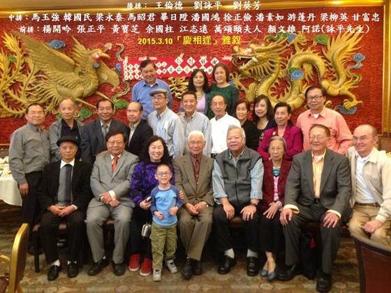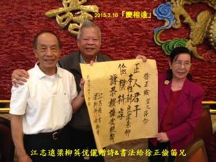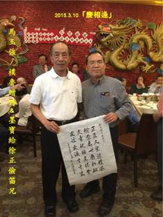 洛杉磯「慶相逢」酒樓,沾『善性循環』作者黃寶芝的光,席間令我喜出望外的竟然能見到風笛總籌潘國鴻,有古詩詞狀元的畢日陞,有著『孤單的美國人』的作家林小萍,有詩詞前輩的余國柱,古詩精湛的張正平博士,有詩才洋溢的馬昭君(扶風),有書法篆刻家的甘富忠,有古詩詞秀才的樸魯,有洛城才女的劉詠平(艾玉)作家,有名氣超逸的游蓬丹作家,有滿腹詩墨的王倫徳,還有許多從未謀面的詩友文友響應前來,場面陣容壯觀,令我感動難忘,大家共聚一堂,歡樂喜氣洋洋!我暗自竊喜慶幸不枉此行,獲得的比自己想像的還要多。 席間獲詩人江志遠及馬玉強贈墨寶,梁柳英贈禮物,余國柱及張正平即席吟詩相贈,作家林小萍及詩人樸魯贈著作,榮惠國贈金字典,今次遠道而來,洛杉磯是風笛詩壇的集中地,當地笛友們不知是否生活在四季溫和的氣候所影響,每個人都春風滿面,熱情奔放,真教人暖在心頭。有時候我黙黙在想,世界有許多有陽光照得到的好地方,而自己却偏偏走到霾霧瀰漫冷得要命的冰天雪地求棲息!究竟為的是無從選擇,或是落地生根的固執心態?「無奈!」,也許是一句最佳的自圓獨白吧!。