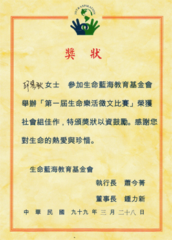 2010.3.28榮獲台灣生命藍海教育基金會舉辦 「第一屆生命樂活徵文比賽」社會組佳作獎狀