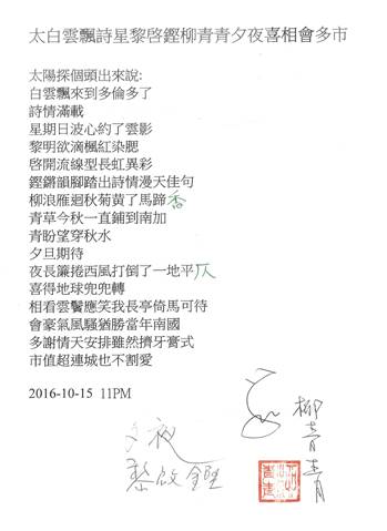「太白雲飄詩星黎啓鏗柳青青夕夜喜相會多市」(藏頭詩),