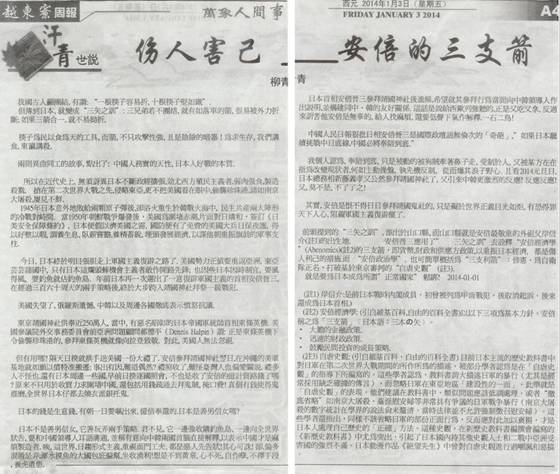 我國古人籲團結, 有謂: “一根筷子容易折, 十根筷子堅如鐵” 。 但傳到日本, 就變成“三矢之訓”: 三兄弟若不團结, 就有如落單的箭, 很易被外力折斷; 如果三箭合一, 就不易拗折。 筷子為民以食為天的工具, 而箭, 不只攻撃性強, 且是陰險的暗器 ! 為求生存, 我們講食, 東灜講殺。 兩則異曲同工的故事, 點出了: 中國人務實的天性, 日本人好戰的本質。 所以在近代史上, 無須訝異日本不斷政經擴張,効尤西方殖民主義者,弱肉强食,製造殺戮。搶在第二次世界大戰之先,侵略東亞,更不把美國看在眼中,偷襲珍珠港,諸如南京大屠殺,屢見不鮮。 1945年日本意外地敗給兩顆原子彈後,卻浴火重生於韓戰火海中, 民主共産兩大陣形的冷戰對峙間。當1950年朝鮮戰爭爆發後,美國為圍堵赤潮,片面對日媾和,簽訂《日美安全保障條約》, 日本便假以濟美國之需, 國防便有了免費的美國大兵日保夜護, 得以好整以暇, 調養生息, 臥薪嘗膽,養精蓄銳, 埋頭發展經濟, 以謀他朝重振旗鼓的軍事支柱 今日, 日本終於明目張胆走上軍國主義復辟之路了。美國勢力正值要重返亞洲, 東亞芸芸諸國中, 只有日本這爛頭蟀機會主義者敢作開路先鋒; 也因此日本因時制宜, 要風得風, 要釣魚就佔釣魚島. 年前日本再一次選出了一意復辟軍國主義的首相安倍晉三, 在經過三百六十周天的兩手策略後,終於大步跨入靖國神社拜祭一級戰犯。 美國失望了, 俄羅斯遺憾, 中韓以及周邊各國徹底表示憤怒抗議。 東京靖國神社供奉近250萬人, 當中, 有惡名昭彰的日本帝國軍統帥首相東條英機. 美國參議院外交事務委員會前亞洲問題顧問郝德平(Dennis Halpin)謂: 正是東條英機下令偷襲珍珠港的, 參拜東條英機就像向拉登致敬. 對此, 美國人無法忽視。 但有用嗎? 隔天日揆就拱手送美國一份大禮了。安倍參拜靖國神社翌日,在沖繩的美軍基地就如願以償特准搬遷; 事出有因,難道偶然? 禮照收了,難怪臺灣人也偏愛關説。禮多人不怪也.還有日本周邊一些國,早前日揆逐國照會, 不也是收了安倍的億計買路錢了嗎? 原來不只用於收買力求圍堵中國, 還包括用錢疏通去拜鬼賊, 掩口費! 真個有錢使得鬼推磨,全世界日本仔都去燒衣派銀托鬼 日本的錢是生意錢, 有朝一日要嘔出來, 億倍奉還的。日本是善男信女嗎? 日本不是善男信女, 它善玩弄兩手策略。君不見, 它一邊強收購釣魚島, 一邊向全世界告狀, 要和中國領導人耳語溝通, 並稱有意向中韓兩國首腦直接解釋,以表示中國才是麻煩製造者。唉, 這世界,日趨形式主義,重視面門工夫, 都是惡人先告狀!其心可誅! 卻,偏多混淆是非,渾水摸魚的大國包庇偏幫,坐收漁利!想是不到黃泉, 心不死, 自作孽, 不擇手段, 養虎遺患。 日本首相安倍晉三參拜靖國神社後詭稱,希望就其參拜行為當面向中韓領導人作出説明,並構建同中、韓的友好關係。這話是說給西歐列強聽的,正是又吃又拿, 反過來訢苦他安倍是無辜的, 給人找麻煩, 還要低聲下氣作解釋。一石二鳥! 中國人民日報狠批日相安倍晉三是國際政壇語無倫次的「奇葩」, “如果日本繼續挑戰中日底線,中國必將奉陪到底.” 我個人認為, 奉陪到底, 只是被動的被狗賊牽著鼻子走, 受制於人, 又被某方在在指為改變現狀者,何如主動操盤, 執先機反制,從而爆其浪子野心。且看2014元旦日, 日本總務相新藤義孝又公然參拜靖國神社了, 又引來中韓更激烈的反應! 反應反應! 又, 莫不是, 不了了之! 其實, 安倍是恨不得日日參拜靖國鬼社的, 只是礙於世界正義目光如炬, 有恐得罪天下人心, 阻礙軍國主義復辟罷了。 前頭提到的“三矢之訓”, 源出於山口縣, 而山口縣就是安倍最敬重的外祖父岸信介(註①)的出生地。安倍晋三應用了“三矢之訓”去詮釋“安倍經濟學”(Abenomics)(註②)的三支箭,即貨幣、財政和供應方政策,以重振日本經濟, 都是傷人利己的措施。而 “安倍政治學”, 也可簡單概括為“三支利箭”:修憲、為自衛隊正名、打破基於東京審判的“自虐史觀” (註③) 。 就是要為日本成為所謂“正常國家” 鬆綁! 2014-01-01