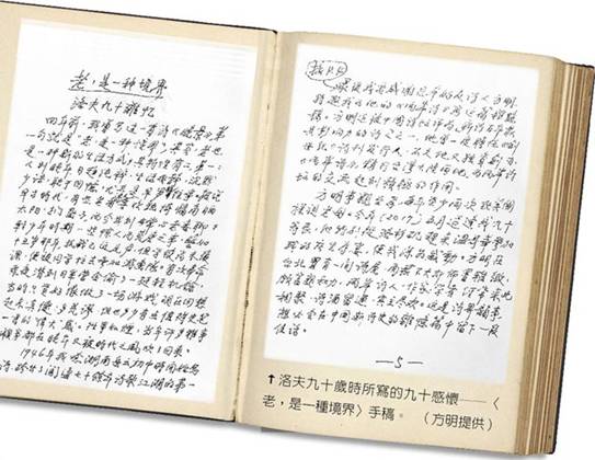 : 自2017年3月洛夫先生在加拿大驗出有惡疾之後,是年6月8日返台治療,同時親近子女,惟病情時好乍壞,無法有新的詩作,唯洛老答應為《兩岸詩》詩刊寫一篇九十生涯之感懷,作為此生大部分總結,遂於2017年11日3日完成此篇「老,是一種境界」(