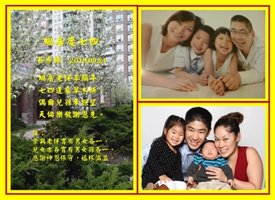 余與老伴育有男女各一,兒女亦各育有男女孫各一,感謝神恩保守,福杯滿溢。
