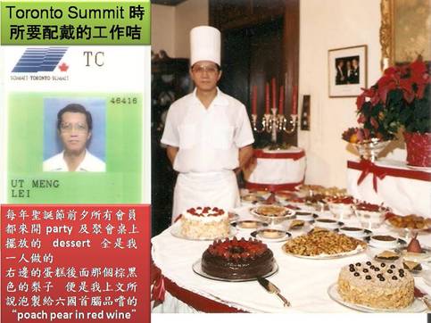 TORONTO CLUB 進行。這麼重大的國際會議和出席者都是六大國的首腦,警衛工作當然是非常森嚴,這已不在話下。在晚宴進行中,我在完成手頭上的工作後,便趁機掀開廚房的大門,偷窺宴會廳內的盛況,可能我真是幸運,上天讓我親眼見到美國總統列根RONALD REAGAN,英國首相戴卓爾夫人MARGARET THATCHER,加拿大總理梅隆尼BRIAN MULRONEY,法國總統米特蘭Francois Mieterand,德國總理戈爾Helmut Kohl 和日本首相田中角榮 等。你說,這真是千載難逢的機遇啊!