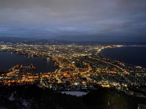 傍晚吃過晚餐後,導遊帶領我們搭乘纜車登上「五陵廓塔」,參觀極負盛名的函館夜景。因為函館山是一座孤懸在海上的半島,與一道狹長的頸岬,呈扇型與市區相連,由於地形的因素,使函館的夜景展現雙曲弧線的造型,我從高處往下看函館市區五個巨大呈菱型輪廓的萬家燈火,有如鑽石般閃爍著令人興奮的耀眼光芒,看來的確是別具特色,這自然天成及巧奪天工的迷人景色,配上海上遠方隱約可見的點點漁火,堪稱人間一大絕色美景,它與香港的太平山上及義大利的拿坡里夜景並列為世界三大夜景。我們到此觀賞號稱為百萬夜景,覺得真是值回票價了。