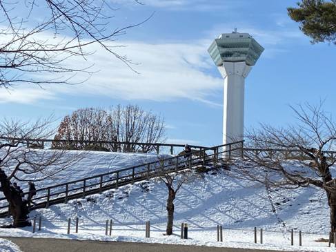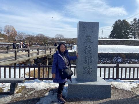 第三天,我們去參觀充滿異國風情的當地「朝市場」,市場內有數百家商店,販賣各式海鮮產品之外,還有精緻可愛的貝類裝飾品。很多遊客都傾囊購買,我也購買了一些藻類海產及貝類乾貨,價格比臺北大稻埕迪化街便宜很多。接著,我們去函館市的地標「五稜廓公園」參觀,這是一座具有歷史事蹟的公園,也是江戸時代末期建造的軍事要塞,明治維新時期的箱館戰爭中最後一戰的發生地點就在此,故五稜廓在日本近代史上佔有重要的一頁,被選定為北海道的文化遺產。據說五稜廓原建築本是一座歐洲式風格的城堡,以五個V字型打造成五角星型的特殊型態。這座曾見證歷史的城堡如今只剩下了城牆的外廓,城堡內現改闢為花園,園內遍植櫻花,據說約種有1600株櫻花樹,成為北海道有名的賞櫻勝地,但可惜我們來得太早了,現在是來賞雪不是賞櫻的時節。在城廓內有座函館博物館,保存著當年箱館戰爭時使用的武器如大砲等,當年戰時的石牆仍保留著,石牆環繞的堡壘有長約1.8公里的護城河,河寬約有卅公尺,這時候整個河面上的河水早已冷卻結冰,只見是白茫茫的一片。