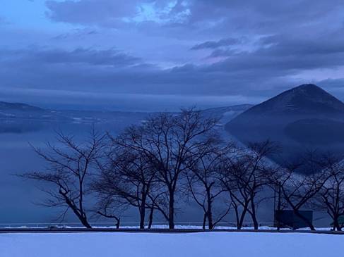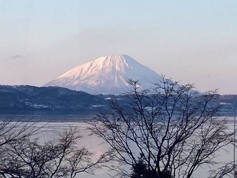 晚上,我們入住「洞爺湖」區的飯店景觀房,房間內有大片的玻璃窗,正面對著著名的洞爺湖,及可遠眺有「北海道富士山」之稱的羊蹄山,海拔1898公尺的羊蹄山是北海道的象徵,也是日本百岳的名山之一,它是一座美麗的標準圓錐體成層火山,雖然只有富士山(3776公尺)高度的一半,但看起來樣貎非常相像,好像是個雙胞胎山似的,因此羊蹄山被稱為「蝦夷富士」,北海道古稱「蝦夷」,也就是「北海道富士山」的意思,但我們戲稱它作「假富士山」。最有趣的是當遠眺時,羊蹄山也有富士山神出鬼沒的奇蹟,我們傍晚入住景觀房後,面對著窗外看它,明明是清晰可見的,我們還給它拍了許多幀照片,想不到翌日早上往窗外看去,羊蹄山竟然不見了,我在想怪不得有人說日本富士山是假的,因為有觀光客到了觀山最佳地點後,連富士山的影子都沒有看到,是雲是霧把它完全遮蔽住了?抑是整座山的茫茫白雪受到光線的反射所造成?羊蹄山居然也有樣學樣,我們前天傍晚明明看到它屹立在那兒,翌日早上朝它的方向看去,連影子都找不到,反而別的距離比較近的山倒是清晰可見,哈!它會變魔術? 還是發生神跡呀?