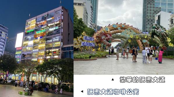 西貢阮惠大道附近一帶是胡志明市的蛋黃區,這兒有五星級飯店林立,因越南過去曾被法國統治將近有百年時間,留下了不少歐式風格的建築,包括一些知名的老牌大飯店,如美麗的大陸(歐陸)Continental飯店和麗池REX飯店等……都是有逾百年歷史的建築,觀光遊客來到這兒一定會拍照及打卡,以留作紀念。從傍晚時起,這兒附近一帶到處都是五光十色的璀璨燈火,照耀得眩然奪目,馬路上川流不息、如萬馬奔騰的機車和汽車,行人道上熙來攘往、絡繹不絕的人群,好一片熱鬧繁華的景象。