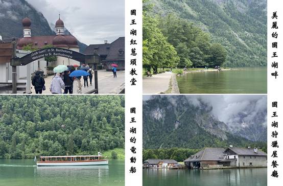 我們抵達後隨即登上電動船暢遊國王湖 ,在青山、綠水、和藍天的相映下,這兒的湖光山色實在是美不勝收,它清澈幾乎可見底的湖面上泛著翠綠山林的倒影,更是多了一些詩意的迷濛,使我們感到眼前的世界彷彿到了另一種如夢似幻的境界。當船開到湖中央時,船長特地用喇叭向著遠處的高山吹奏一首曲子,讓我們感受一下回音裊裊,音樂聲多重地繚繞盪漾在空間中的感覺,真是十分有意思的經驗,為酬謝船長的用心,大家鼓掌勉勵並贈予小費。國王湖的西岸有個著名的紅蔥頭教堂(聖巴托羅美禮拜堂)St.