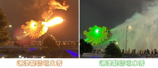 ,龍頭好像特地稍為偏傾一些,有些水都噴到站了橋上最佳觀賞位置的觀眾,惹來一陣笑聲和尖叫聲,這場秀真是充滿了歡樂和趣味性。我們看罷秀後回飯店休息,因為翌日中午,我們將在玩過飯店正對面的美麗「美溪沙灘」My