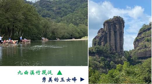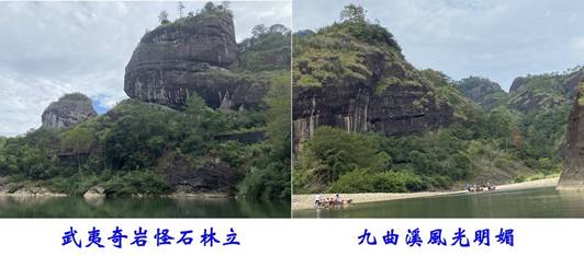 午飯後,我們接著的行程是搭乘竹筏暢遊「九曲溪」,溪流全長約62.8公里,兩岸奇峰怪石林立,「九曲溪」乃發源於武夷山自然保護區的「黃崗山」南麓,溪水彎彎曲曲地繞著武夷群峰流淌,從一到九曲一共轉了九個彎,故因而得名,當溪水繞過每座山貎各異的山頭即打造出一番不同的美景,可說是處處皆是景,真是美不勝收。我們在「九曲溪」竹筏漂流約9.5公里,時間約九十分鐘,從九曲到一曲順流而下,沿途溪水清澈可見溪底,大小溪魚相當多,團員購備飼料忙著餵食,我則專心欣賞眼前絕佳美景,此時人在溪中正是抬頭可觀山景,俯首能賞水色,側耳則聽溪聲,垂手即觸清流,而且全程視野十分開闊,令人大有心曠神怡之感,因此在九曲溪搭竹筏漂流賞景,實是一趟不可錯過並頗具趣味性的行程,尤其是竹筏一前一後兩位船夫都非常熱心,他們一邊撐著竹筏一邊沿途輪番介紹九曲溪的風光,相當傳神且兼有趣。我們遊至溪流中段處時,抬頭看到高掛在峭壁岩洞內距今約有三千八百多年歷史的懸棺,甚具神秘感。而整條九曲溪的溪底時深時淺,經淺處時甚至聽到船夫搖曳竹竿碰到溪底石子的聲音,而到深處的地方則竹竿無法探底,此時我們坐在竹筏上有隨著水勢漂流的感覺,頗具新鮮感並興趣盎然,深深覺得此行實在是非常值得。
