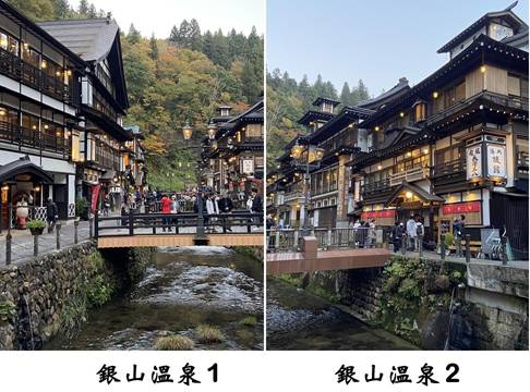 ,因此甚得年輕一輩所喜愛。銀山溫泉區內的中央有一條清冽的河水,河的兩旁有多家木造傳統客棧林立,整個區域氣氛古樸而寧謐優美,充滿著舊式小鄉村古老又浪漫的情懷,入夜後各旅館點亮甚有情調的瓦斯燈,營造出如夢似幻的復古氛圍 ,這兒果然是愛好攝影者最佳的取景處,從每個角度看來都是美得令人不禁摒住了氣息,有人坐在河邊的小池中泡腳,但我們來此只是觀光,沒有泡洗溫泉的準備,因為接著的下一個行程,是前往我們今晚下榻的「秋保溫泉」。