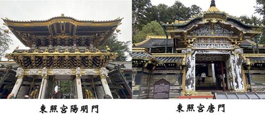 、五重塔、東廻廊、內宮、鳴龍堂……等處,其中日本建築風格的「陽明門」和中國建築風格的「唐門」是東照宮的代表性建築。穿過陽明門,便來到「唐門」。“唐”在日本意味著中國