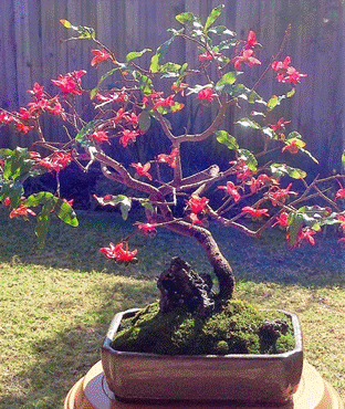 頸聯註:祺樂兄附箋云: 初春盛開的黃梅今轉紅、綵燈似的掛枝頭、慶中秋