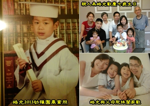 ●滿地可徐正儉笛兄2014. 8. 3箋註: 誰說幸福不可留住,一幀闔家歡照,加上爺爺嵌上一首帶有血緣的娟詩,男孫皓光數十年後,依然看到爺爺留下全家之寶的教誨,看到爺爺笑到如石榴般裂開合不得口的笑容(一笑)。 超文兄,幸福如一片祥瑞柔和的陽光普照著你家門檻,我分享到那股餘溫醇香來自你的闔家照,你的詩,你的寄情,在你有生之年,能把詩賦文章都留給兒孫們作日後的一點記載,這是我最為動容及敬佩的。