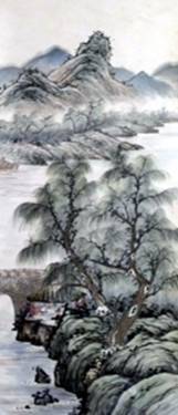 水色山光,樹蔭涼亭;高人對坐,談古說今。雖云地僻江郊午寂寥,卻是幽情如水漲平橋,韻事也。一吟一畫,羨煞旁人矣!