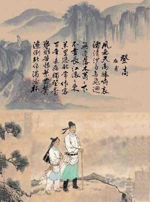 南朝梁吳均《續齊諧記•九日登高》:汝南桓景隨費長房遊學累年。長房謂曰:「九月九日汝家中當有災,宜急去,令家人各作絳囊盛茱萸以系臂,登高飲菊花酒,此禍可除。」