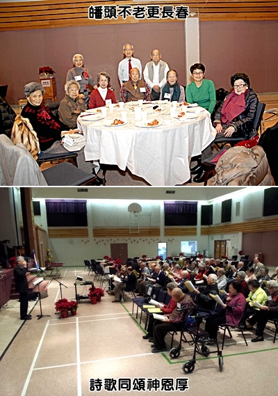 餐聚滿堂笑語親 皤頭不老更長春 詩歌同頌神恩厚 鼎肉壺飧又一巡