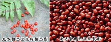 古詩云:「紅豆生南國...此物最相思」,其實生於相思樹之北方相思豆才是。此物心形,有毒,不能吃;破莢後散滿地上,於是滿地見相思。南方食用紅豆,細長形,生於田間,無毒,可作紅豆湯吃。