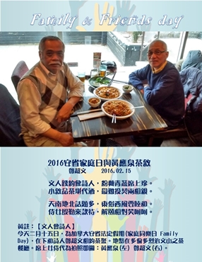 Family Day),在下和詩人鄧超文相約茶聚。地點在多倫多烈治文山之茶餐廰。席上女侍代為拍照如圖:黃應泉(左)