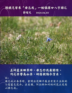 毋忘我於春季時,會開出花瓣平展並有裂片五枚的小型藍色花卉。在美國,阿拉斯加州的州花正是高山毋忘我。