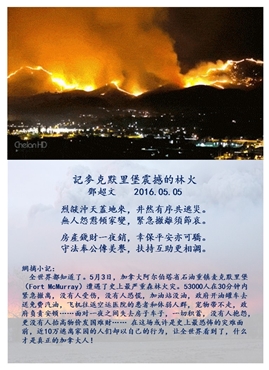 McMurray)遭遇了史上最嚴重森林火災。 53000人在30分鐘內緊急撤離,沒有人受傷,沒有人恐慌,加油站沒油,政府開油罐車去送免費汽油,飛機往返空運醫院的患者和體弱人群,寵物帶不走,政府負責安頓……面對一夜之間失去房子車子,一切積蓄,沒有人抱怨,更沒有人抬高物價發國難財……