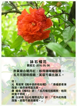 唐韓愈《榴花》詩:「五月榴花照眼明,枝間時見子初成。」