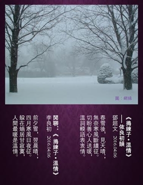春雪後,見天晴。無奈寒風斷續征。切盼善心人送暖,溫詞輭語表衷情。