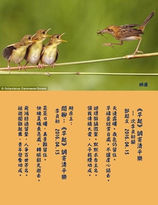 旭日暖融積雪,雁群掠過藍天。春來展翅競超前,奮起精神抖擻。