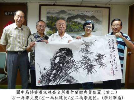 圖中為詩書畫家林亮名所畫竹蘭贈與黃信麗(右二) 右一為李文慶/左一為林建民/左二為李兆民。(李月華攝)