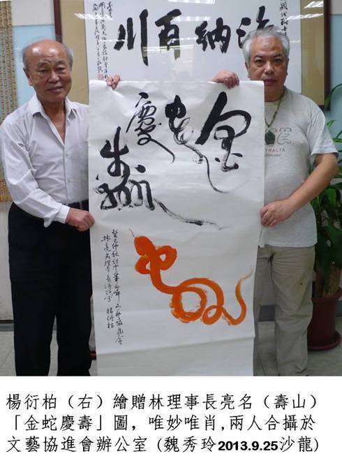 今年九月二十五日,澳洲太平紳士、越南書畫家楊衍柏應中華兩岸文藝協進會之邀到新北市板橋區府後街4-2號2樓表演即席揮毫,專繪風水畫,為人添壽、旺財、引發事業發達。無論繪金蛇、壽帶鳥、長壽石、鯉魚,無不栩栩如生,彩色豔麗,非常討喜。因他的風水畫是不賣的,獲贈者莫不視為珍寶。 楊衍柏之父楊明樞先生係『自由僑聲雜誌社』報刊創刊時之董事。楊衍柏祖籍廣東鶴山人,台北醫學大學畢業,在澳洲墨爾本開設有「古道堂」,經營藝品買賣,也為人解惑。由於其精於藝術及道家之術,獲協進會聘為最高顧問。是晚世廣常務理事林建民先生於天然台餐廳設宴款待楊衍柏,世界華文作家協會祕書長符兆祥先生、林亮名、李兆民、楊博顯、楊廣儀、潘強生、譚凱等人也應邀與會,名酒美食,大快尕頤!