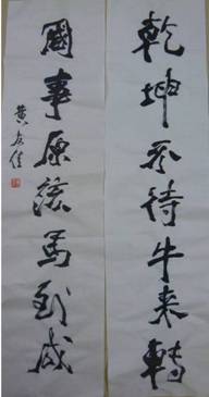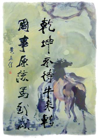台北☆黃寶芝箋注: 嘩,真係好野,友佳宗兄好厲害啊,對聯和畫配合得好極了,我們都好期待「扭(牛)轉乾坤,馬到成功」,昨天我特地去松山奉天宮廟排隊去領馬年的春聯,有位大師在我的春聯加上拓印一幀馬圖,我高興了老半天呢。
