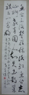 月前台灣保釣民間社團擬成立「釣魚台教育網站」,準網主劉先生來舍下請我用毛筆書寫【釣魚台教育】五個大字作為網站名標誌。我即席揮毫以行、草及楷書各寫一幅讓他回去選擇。隨後我並感賦七絕一首(草書)如下: