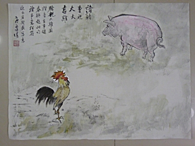 為應景即將來臨的己亥豬年,頃完成《豬視大雞圖》(國語諧音“諸事大吉”)一幅,畫上並題五言絕句一首:
