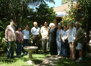 近午時起和雪陽全家到女詩人R.楊舜家。她也是2001年世界詩會的主席。家在西區,是獨門的老屋,沒有樓房(很適合兩位都超過七十歲的老人家),後院有一兩百坪大的草地。有古樹,花叢、休閒的木椅,烤肉區,感覺好極了。