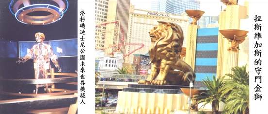 每間建築物內包含著酒店、餐廳、商場、歌舞廳、賭場等,有些更別具匠心,在高層的商場中間建造了威尼斯水鄉風情,室內藍天白雲,坐在臨水屋簷下,手握一杯飲品,觀看著「河」中的泛舟,楫伕唱著悠揚悅耳的民歌,在如此氣氛下的休閒享受怎不令人陶醉!上述酒店就是著名的威尼斯酒店,還有米高梅酒店,剛於今年4月份開幕的PALAZO酒店都是超級的休閒享受,但消費卻令人咋舌!城中建有法國巴黎鐵塔、凱旋門、凡爾賽宮玻璃金字塔的縮型、香榭大道露天咖啡座,以及美國紐約的自由女神肖像等都在賭城「現身」。在入城不遠處於繁華的高樓大廈中,有一隻巨大的金獅,威猛地伏在一座大廈前,傳說這是賭城鎮城「風水」,傳言姑妄聽之!但這隻金獅的確巨大威猛有著令人懾服之威!