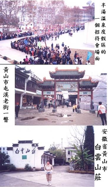從安徽省巢湖市「半湯溫泉」度假區起程到黃山,車程是200多公里,往南走,過長江,穿過蕪湖市公路,經繁昌縣、南陵縣、涇縣、旌德縣、績溪縣,穿縣公路正在拓寬,經棠樾牌坊群;當在公路上疾馳時,距公路大概百米之處,相隔地矗立著七個石牌坊,這是有名的棠樾牌坊群,可惜時間太緊湊,亦不在旅遊章程中,未能下車遊覽,只好在車中遠眺「隔車輕嘆」。數小時後來到黃山市,在「白雲山莊」住下,這是一座建於景區內小山坡旁的二星級旅店,因為我們是參加「經濟團」而非「豪華團」。黃山市當然是不缺四星級酒店。
