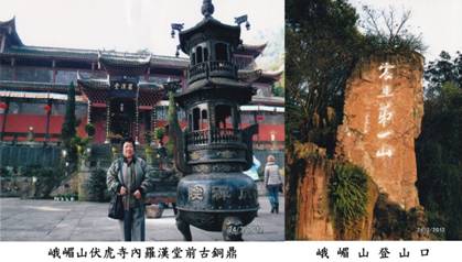 在中國,許多名勝景點的寺廟都要買入門票,報國寺入門券八元,伏虎寺六元。行程表上列明,團費不包含上峨嵋山頂參觀的纜車費用,要另付上山頂車費不成問題,既到峨嵋山若不登上金頂,就如「入寶山空手回」!我有幾位曾到過峨嵋山的朋友已一再提示我,到峨嵋山一定要到山頂欣賞一下那人間仙境,才不枉峨嵋山之行!可惜當地導遊諸多阻撓,說什麼浪費時間,浪費金錢,又說山頂如逢大霧什麼也看不到,山頂是沒什麼好看的!眾團友聽他一輪瞎說,都打退堂鼓,唉!可惜!真可惜!只好「入寶山空手回」!後來在回程飛機上,好幾名成都人都說,近日峨嵋山山頂天氣晴朗,仙境美不勝收,導遊另有安排而已!在峨嵋山的金頂建有賓館,若在那裡住上一宵,雞鳴早起觀雲海,觀日出,人生能幾何!