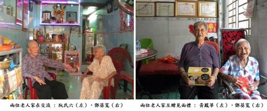 朋友--不論男女老少,他是環繞人們生活中不能或缺的一環,當踏上高齡能夠因緣結識新朋友,這確是一件開心的事。關雄月(美姐)是一位賢良淑德的媳婦,她每天除了要處理生意與家務,更要悉心侍奉高齡的家姑,每天早上都安排老人家在店前安坐與員工及街坊們交流,間中並推著輪椅陪伴老人家到附近吃早餐,更抽暇陪伴老人家到親朋戚友家中聚舊,使老人家的生活在安穩中充滿歡樂。美姐從筆者處得悉在第五郡有兩位老人家比她的家姑還年長且健康,故此經過聯絡認同,美姐主動帶著家姑親臨到訪交流,老人家都歡樂融融交流甚歡。此舉不啻是在黃昏美麗的夕陽留下一抹耀眼難忘的光彩。美姐的家姑鄧葵寬年輕時來自中國廣東鶴山,出生於1926年,夫家是中國廣東四邑伍氏,育四子,美姐是次子媳婦,現已兒孫滿堂,家居第五郡第十一坊梁汝學街136號,老人家在兒孫的孝順下頤養天年。歡樂渡日幸福滿懷。