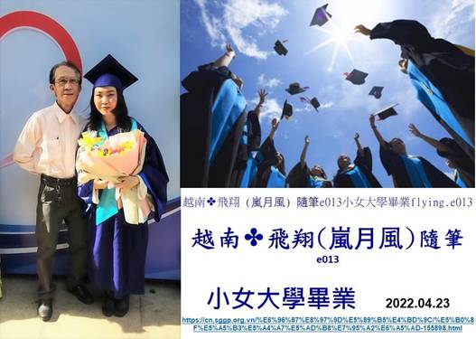 台上還繼續給其他畢業生授予舉人證書而小女卻已跑來我跟前,她哥哥祝賀她,我祝賀她,她接過鮮花,接過四方帽大熊與四方帽小熊,她高興、幸福至眼睛呈現熒光。我對她說:“畢業了!未來是新的征程,新的人生,人生中將度過坎坷和荊棘,繼續無畏邁進、突破,牢記一句話《懂得低頭以便將來抬得更高》。”她擁抱我和她的哥哥,然後我們三人找地方拍照留念。拍好照她叫我先回家,她說和同學還有節目,她又說路程遙遠,天快近黃昏,車輛又多,我摸她頭說好,就這樣,她如春天的燕子於人潮中穿梭找同學去,我遠遠看到她和同學手牽手放飛四方帽奔騰。她哥哥留下等而我取車回家,回家路上一道強烈的陽光照耀著我,猶如萬丈光芒在祝賀我:祝賀我一家人。