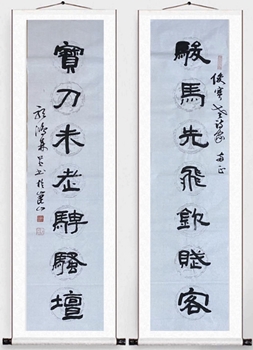 解甲投戈,水意山情融筆下; 舞文弄墨,書風詩韻溢行間。