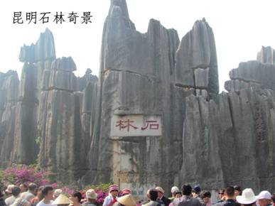 旅遊車是中巴,我們這團總共廿一人,前往石林,車程約80公里,徐姑娘自我介紹是傣族人,樣貎姣好,她說:“雲南是全中國少數民族聚居最多的省份,56個民族之中,雲南就佔卅多。毛澤東時代,知青下鄉,把知識帶到窮鄉僻壤,我們的父執輩奇怪這些青年怎地什麼都懂?尤其戴眼鏡的懂得特別多!傣族人重女輕男,尊奉母系,選女婿必須讓他到家來做三年苦工,自從有了知青,戴眼鏡的只須幹活一年,便獲選為乘龍快婿,這是多麼大的優惠?我們的女孩子叫做哨多哩,男孩子叫做貌多哩,大家記好了,傣族人的示愛方式不是口頭上的我愛你,而是撞屁股"。