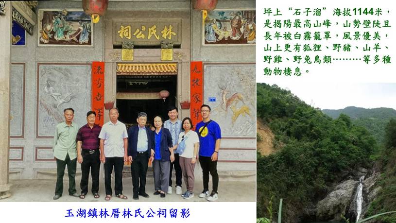 下午三點我們再一起出發,前往揭陽市藍城月城雙河象頭村林氏公廳——玉湖林厝創基先祖處士公一脈源出於此。 時隔七年重來,公廳沒有什麼變化,倒是公廳外修建了一個小花園,園內種植花草和鐘花蒲桃樹(cây hong loc )。而兩邊各有一個鋅鐵板蓋蓬長形亭子,及兩排石椅供大家休息聊天。 公廳裡沒有人在,一位宗親請我們悄候他去找林木雄宗兄,走進公廳,裡面東西有點絮亂,似乎平時沒有專人管理。 木雄宗兄回來了,他把我們請到公廳右旁一間房子與諸位宗親相晤,大家在這𥚃喝茶,聊了半小時,告辭前大家一起在公廳正前面拍照留念。 接下來我們前往坪上村拜訪我另一位親戚林瑞喜。以前我一直搞不清我們之間的關係,原來他們是我二姑的孫子,石門池的林鳳珠表姐便是他們阿姑,坪上村直屬玉湖鎮,它之地理特點就是坐落四面環山,村民自古以來靠著種植茶葉謀生,坪上綠茶聞名遐邇,也曾出口過外國去。而坪上古代多為客裔居民,但由於地處揭陽、潮州及梅州交界點、歷經各個時代與鄰近潮籍族群的婚嫁關係,如今潮州話已經變成坪上地方通用語言。 坪上村以劉林兩個姓氏族裔的主體族群,過去曾有過輝煌時代。不過如今隨著潮流趨勢,坪上不少年青人走向外地打工去發展,留下來的多是老一代及婦孺孩童。 還記得二十多年前,我與大兒子偉川曾來了坪上一次,見到一位表哥。那時他年紀六十多歲的樣子,身體健康不很好,走路困難,要用手拐。見到我他非常激動,我們還拍照留念。 幾年前我回老家時瑞喜的妹妹林碧華曾到浮山許家和我們相見。 坪上“石子溜”海拔1144米,是揭陽最高山峰,山勢壁陡且長年被白霧籠罩,風景優美,山上更有狐狸、野豬、山羊、野雞、野兔鳥類……等多種動物棲息。 林瑞喜的家並不難找,祗是車子沒辦法開到門口,我們必須徒步走一段有點斜坡的水泥路,我見到林瑞喜夫婦與一個身段胖胖相貌也好像她老媽的女兒,但他妹妹碧華不在家。 本卻值這次難得相見機會我盡力弄清楚一些有關我們家族之間但我還不瞭解的事情,可惜林瑞喜也祗能提供那麼一點點的資料而已,使我感到很失望!