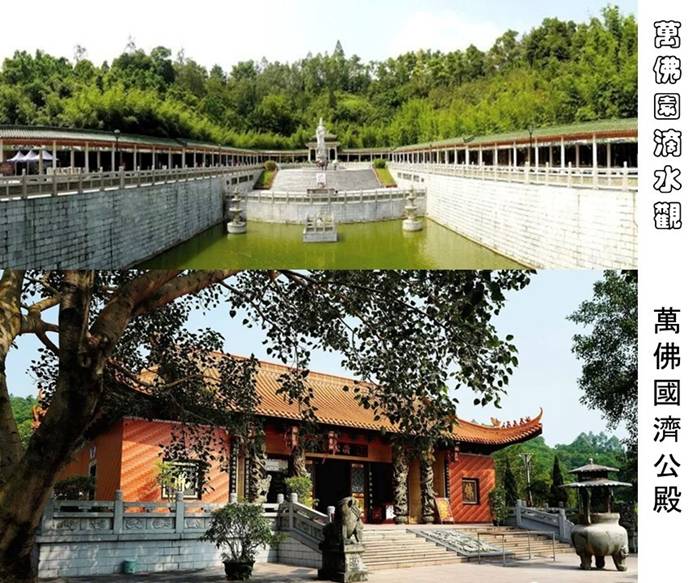 濟公俗名李修緣,號湖隱,南宋紹興十八年(1148年)生於浙江天台縣台州府永寧村,少年出家於杭州靈隱寺,師承佛海慧遠禪師,法名「道濟」。道濟「好誦經打坐」但不戒酒肉,性格幽默、衣帽破舊、手持破扇,寺僧投訴慧遠禪師面前。主持禪師曰:「佛門之大,豈不能容一癲僧!」。故又有「濟癲」名號。慧遠禪師圓寂後,濟公被迫離開靈隱寺投身杭州「淨慈寺」。道濟學問淵博,精湛醫術,濟世行德,造福眾生,世人尊為「濟公活佛」。 道濟於宋寧宗嘉定二年(1209年)五月十六月在杭州淨慈寺圓寂享壽六十一歲。臨終前濟公曾作一偈(梵語,一種有的近乎散文有韻的詩詞):「六十年來狼藉,東壁打到西壁,如今收拾歸來,依舊水連天碧。」今浙江杭州跳虎泉曾有道濟禪師舍利塔,後人為紀念道濟禪師修建濟公塔院於此。道濟禪師傳世著作有:《秉火文》.《掛真文》、《入龕文》、《起龕文》、《入塔文》現存於《淨意寺志》。 濟公殿於二十世紀九十年代末,由當地社會熱心虔誠信徒及海外熱心人士捐助修建,基於資金有限所以只能修築濟公殿及觀音閣。至二十一世紀初葉一個規模完整的群體建築才在梅州市、豐順縣佛教會與當地善信鼎力支持下終於完成。 徒步走一段萬佛園山路即可抵達濟公殿,但欲登濟公殿大家需要攀登九十九級台階,每三十三級便有一個行步平台讓大家稍為休息一下後再接續往上攀。濟公殿佔地總面積760平方米,仿照中國北方寺院模式建築,殿高十九米,殿坐北朝南,大殿前一個寬闊平坦廣場,殿坐落於雕刻花草鳥獸的大理石圍欄內,左旁有一棵枝葉茂密的菩提樹,殿前七級台階,台階正中有精美石浮雕,兩邊豎立兩尊石雕雄獅,在中國傳統概念:石獅象徵威嚴、至尊、且具有驅邪除煞、守護寺廟。殿前有座專供善信捻香的碩大的石香爐,香爐兩側各有燭台一座,左旁有一焚冥葫蘆。貼圍牆有二座六角形建築——鐘樓及鼓樓。 濟公殿琉璃瓦頂,紅牆碧瓦,彩樑畫棟,斗拱翹角,圓柱構架,殿前四根龍柱剔透雕刻,神龍祥雲繚繞,龍姿栩栩如生,使整座殿院顯得更為威嚴厚重宏觀,左右牆壁上各嵌有一個很大的《佛》,寶殿二進一橫院落四合式,左右兩廂房建築。上堂正中乃濟公塑像,塑像全身金光閃亮,臉容慈祥和藹,濟公聖像前長桌擺滿花果祭品,左側有一烏亮木魚。大殿共支柱十二根,柱均漆金佛聯,聖像左右雙聯為「瑤池何處無人知邊近或遠,靈山此處有心覺悟萬里長與深」。濟公殿內部有不少藝術價值的雕刻作品,令人目不暇給,且殿後還有一幽靜小山徑,從此登山有“白虎吐珠”、“佛祖彈琴”景點,一路山徑迴轉仿若一巨大琴鍵。於此更有一如鏡山池,於此颯颯風涼,有脫塵出俗的感覺! 清韻閣建築精緻、曲徑深幽、花樹亭影,垂柳戲水,是一個欲暫離市都喧囂以尋覓片刻寧靜的好去處。正如閣柱雙聯:《清風迎雅客山水有情藏美氣,韻雨伴詩書天地無私溢蘭香》。清韻閣可以給人們晨曦霧靄朦朧、春雨綿綿及夏夜皓月如鏡倒映水面朦朧神秘之美。可惜此際我卻什麼也沒有見到——除了周邊踵接擁擠遊人! 九曲橋可以稱作萬佛公園最為浪漫最為詩情畫意的景點,人們不易分別究竟是煙雨美了九曲橋或者九曲橋使這幅彩墨一般的濛濛煙雨更富詩意?問問建橋當年建橋師博都不能有個正確答案,尋思良久之後或許會說:「兩者都一樣罷!」 九曲橋美在它曲折迂迴,美在它雕刻精美、瑰麗而不庸俗、人於橋上既可遙眺山光水色,靜步橋板,使心靈脫俗而優遊花蔭影樹。君不見涼亭對弈棋手正沉醉於忘我境界?君不見一壺初沏龍井芬香裊裊?人生在世擁有如斯愜意一夕又有何憾?而當年建造此橋時建橋師也已把中國人心目中的“九”字——吉祥平安的意義寄寓在九曲橋的畫章裡了! 而我,我是來去匆匆的過客,無緣撐傘九曲橋煙雨,也不能作觸景興情的詩人墨客,倒是感覺輕風送來些微十月晚秋初涼! 滴水觀音獲規劃為萬佛園六大景區之一,佔地面積一萬多平方米,耗資一千五百多萬人民幣,而新加坡豐順會館會長何僑生先生捐款八百多萬人民幣完成主體建築。 觀音大士純白石像佇立於蓮台上,面含笑容,慈祥和靄,左手持缽右手持瓶瀉水,有“如甘露法雨,滅除煩惱焰”之意,遊人從多個角度都可看到觀音大士雍容。另外還有一個放生池,池塘裡養了無數的各種顏色的鯉魚,牠們在跳躍相爭奪遊客拋下的魚餌,蠻好看! 中華龍坐落於萬佛園虎頭山上,工程由揭西縣棉湖宏興古建工藝廠承建。(2002壬午~2004甲申年),是一座相當美麗又富有文化意義的藝術傑作。 而中華龍牌坊建築亦相當宏偉,牌坊四柱三門,牌坊上頂有雙龍拱珠浮雕,四柱上均有一尊小獅子雕刻。正門上方橫匾書寫《中華龍》左右兩測上方刻有《風調,雨順》、《國泰民安》,外聯:《四海翻騰雲水怒》,《五洲震盪風雷激》,內聯則為:《虎踞龍盤今勝昔,天翻地覆慨而慷》,正門柱下各有一尊石雕獅子。 中華龍以琉璃瓦及鋼筋水泥等建築物料製作,依順山坡蜿蜒起伏彎曲而建、栩栩如生,遠看彷彿一條飛騰升空的猛龍。遊客必須攀登639級台階方可到達高14met的龍口,龍身全長318met,高3met,寬則從1m5至2m8。長廊壁畫共138幅包含了盤古開天、女媧補天、萬世師表孔聖、秦滅六國天下一統宏圖、秦初之商鞅變法、漢高祖約法三章(即漢初廢秦律而頒行之三章法律)、傳誦千載西漢明妃(王昭君)這出北塞嫁給匈奴單于清淒故事、唐