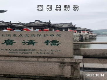 十月十四日(第八天) 我們來到廣濟橋的時候已經是下午四點許了。樹發表姪告訴我廣濟橋不必那麼早去,白天可以看到廣濟樓和整座古橋橫跨兩岸景色,只是它最吸引遊客卻是晚間。 廣濟橋是廣東潮州八大著名景點之一,古稱康濟橋、丁候橋,民間通常稱湘子橋,因為民間流傳著一段八仙裡韓湘子曾大顯神通使廣濟橋能順利完成的神話故事。 廣濟橋坐落於廣東潮州市古城外,橋橫跨韓江並聯結東西兩岸,它與蘆溝橋、洛陽橋、趙州橋並稱中國四大古橋,乃古之粵省通往閩浙諸地交通要道。 廣濟橋始建於南宋孝宗乾道七年(辛卯1171)初時由浮船連接東西兩岸,中間可拆開以便船隻通過。後來逐漸韓江中修設石墩,南宋皇帝宋理宗紹定元年(1228)已建成石墩廿三座,橋長520米。 不過打從十二世紀到廿一世紀八百多年漫漫歷史長河,廣濟橋見證了宋、元、明、清、民國以至新中國的轉朝換代、橋不止一次被毀於烽火硝煙也多次進行修葺重建。從現存歷代文獻上檔案與民間資料我們可以看到多次重大修築其中最值得注意的是: 明宣宗宣德十年(1435)時任潮州知府王源大修康濟橋,建樓閣十二座、橋屋126間,從此統一使用「廣濟」作橋名,且沿用至今。 明武宗正德八年(1513)知府譚倫增設石墩一座,至世宗嘉靖九年(1530)減掉浮船六隻,形成如今之十八梭船廿四洲風格。 清世宗雍正二年(1724)潮州知府張自謙修廣濟橋,並鑄鉎牛兩隻分置於東橋第十二墩及西橋第八士墩。意為「鎮橋御水」。道光廿二年(1842)洪水為患導至東墩之全生牛被墜入江中。固民間有歌謠:「潮州湘橋好風流,十八梭船廿四洲,廿四樓台廿四樣,二隻鉎牛一隻溜」。 新中國成立後,1958年當地政府便著手對廣濟橋作全面修葺加固。 2003年∼2007年,中國政府按廣濟橋最輝煌時期的藍圖對廣濟橋進行重修,恢復了「十八梭船」可開啟式浮橋。修復橋上十二座樓閣,十八座亭屋及加置對聯匾額,廣濟橋現存石墩廿一座。 廣濟橋為中國全國重點文物保護單位,並定位為旅遊觀光步行橋。