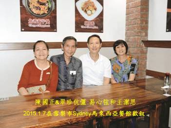 (一) 於2015年元旦(歲次甲午十一月十一日)又一個機緣,讓我在人生旅途中再裝飾一個美夢,點燃一次亮麗的行程──澳洲之旅。 當晚九點乘搭越航VN 773直飛澳洲悉尼市Sydney。翌日元月二月星期五早上九點半,飛機降落澳大利亞悉尼國際機場,悉尼市的富球旅遊公司總經理莊豐成先生親自來接機,並送我們四人(我和內子翠珍,長子敦堯及內孫女)到距中國城步行約十五分鐘的一間三星旅店ASPIRE HOTEL。辦理登記手續後,隨即帶引我們家人到唐人街逛商店(藉以證明旅店離中國城不遠),最後介紹我們到一間大商場MARKET CITY三樓的餐飲區用膳,之後揮別,確實莊先生接待顧客非常熱誠、週到。 本來赴悉尼之前幾天,我和一位老同學梁少梅與其丈夫林耀才兄在電話中約定元月二日晚六點在旅店會面,之後大家同去用晚膳。但當我們在MATKET剛用完午飯時,少梅給我一個意外的驚喜,她突然出現在我眼前,真是出人意表。原來耀才兄和莊豐成先生本是老友,所以要耀才兄從莊先生得悉我們用午飯地點而到來,還有在商場樓下,由於泊車不方便,坐在車上等待的耀才兄之外,還有天涯闊別,已卅年不相見的劉安寧表弟。 於是大夥兒一齊回我下榻的旅店房間,一番寒暄,彼此冰封了多年的感情得以解凍,尤其安寧表弟這個老表之情都快長出了青苔。那年,一個荒涼的揮手,就揮別了數十年。猶憶當年,我和少梅、安寧都是同校,我們的青春都已捐給戰火,如今,大家的鬢髮斑白,尤其安寧表弟已是半個禿頭老人了。頓時,讓我想起2010年在巴黎追夢時,曾與隔別廿年的王明洋、明海、明河、秀梅等各表弟妹們相聚,如今,在悉尼與安寧相聚,我不知道這是不是所謂緣份。 要說的舊事太多了,那時已是下午三點了,他們告辭,大家相約當晚六點再餐聚。 當晚六點,少梅一個先到,耀才兄稍後才來,她帶我們漫步悉尼市中心唐人街,在這裡讓我體驗此地華人生活的聲色風情,尤其當晚適逢每週星期五,這兒的一條步行街DIXON Street才有擺賣夜市的各攤檔,擺賣各式燒烤食品、紀念品、服裝……營業至深宵,遊人如鯽,非常熱鬧,好比香港的廟街,此唐人街的喧鬧是充滿感情的律動;而且別致的,是這條步行街的街道兩頭都建有龍門牌坊,牌匾上以金色題字:“四海一家”和“通德履信”,富有東方傳統文化之美。 約七點,耀才兄來電,他已在唐人街一間華人“八樂居”大酒樓等候我們。 席間,大家一面品嚐美味的佳餚,一面細訴彼此戰後餘生的人生歷程,曾經一段日子大家走過荒涼,如今,歲月的皺紋都爬滿額上……。