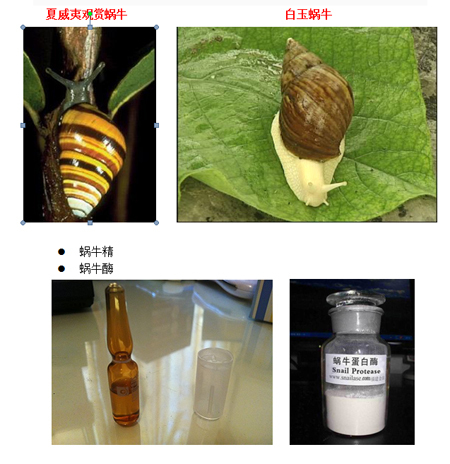 蝸牛食譜共有中西菜色200道,最普遍是法式焗蝸牛:把蝸牛肉挑出,洗淨後剁碎,加上作料後翻炒,再填入蝸牛殼內,用麵包屑拌牛油封口,放入烤爐焗十五分鐘,上盆即成。法國人吃這道菜時要用特製的叉子和鉗子(上圖)。這不僅是傳統法國大餐,還成了聖誕餐必備菜色。在美國紐約,一盆六只的焗蝸牛售價18塊美元。中式蝸牛菜有蜜汁蝸牛、香芋蝸牛、香辣蝸牛、蝸牛燉肉、鹵汁蝸牛等等。 智利工人飼養蝸牛時偶然發現,蝸牛粘液具有修復損傷的奇效。瑞士蝸牛美容研究所進行研發,發明了“蝸牛護膚霜”,成為全球女性美膚產品和傷口愈合最佳護理品。 西班牙是蝸牛飼養業發達國家,他們利用萃取蝸牛原液液製成“蝸牛精”,每盒7支安剖,臨睡前使用一支塗抹臉部,成了最時髦的美容品。 哺乳動物對蝸牛細胞完全沒有免疫藩籬,俄羅斯科學家利用這一特點把蝸牛神經細胞移植到白鼠大腦醫治帕金森氏綜合症,取得巨大成功,現在正對志願者人身試驗,非常有希望成為老年痴呆症患者帶來福音。從蝸牛身上提煉出來的“蝸牛素”,是一種良藥,經過加工配製,可醫治壞血病、前列腺肥大、哮喘等疾病。 蝸牛酶(酵素)是從蝸牛消化道中製備的混合酶,它含有纖維素酶,果膠酶,澱粉酶,蛋白酶等20多種酶。它可以用於酵母細胞壁的破碎,因此廣泛用於細胞生物學和基因工程學的研究;它可做飼料添加劑,從而提高飼料的消化率;也可用作果汁澄清,橘子脫囊衣,果醬製作等。 從無色的蝸牛血可以提煉凝血素,廣泛應用於免疫學領域。國際市場每克凝血素價格100美元,比黃金還貴,因此中國人把蝸牛叫做“軟黃金”。 蝸牛加工工廠的產品是冷凍蝸牛肉和蝸牛罐頭,它的下腳料都可以利用:內臟可以製造高蛋白飼料,螺殼可以補充鈣質。色彩斑斕的夏威夷蝸牛(左圖)還是一種觀賞動物,殼可以臟作工藝品。說蝸牛“一身都是寶”一點都不誇大。
