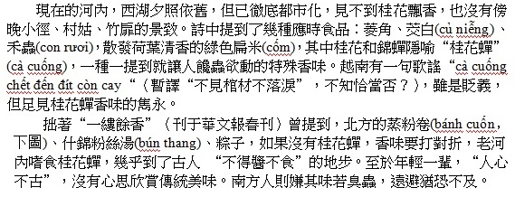 河內三伏天酷熱難當,晚上即使電風扇開足馬力,吹出來也是一股熱風,令人難以入眠。河內冬日平常不冷不熱,但只要寒潮乍到,立即寒風透骨,任你重重包裝,還是直打哆嗦;即使生長在冰封國度的人說起也是談虎色變。比冬老人早半拍,當西北風掃落街頭法國梧桐的一片片落葉,人們就“一葉知秋”。秋風送來沁人心肺的涼意,老東京稱為“heo may“,我找不到恰當的中譯詞。有趣的是,差不多所有的河內美食都集中在這個金色的季節。我雖然不是河內人,但四年負笈,已跟河內結了不解之緣。我曾寫了一首詩表達對半個世紀前河內之秋的懷念: