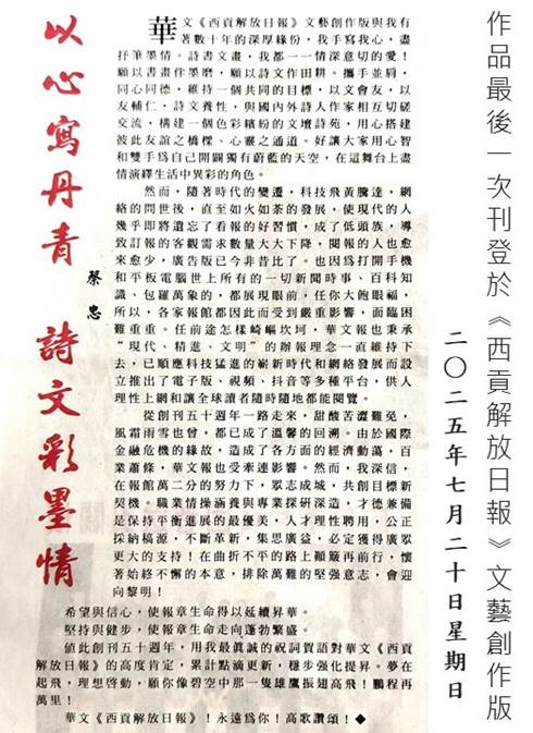 華文《西貢解放日報》文藝創作版與我有著數十年的深厚緣份,我手寫我心,盡抒筆墨情。詩書文畫,我都一一情深意切的愛!願以書畫伴墨磨,願以詩文作田耕。攜手並肩,同心同德,維持一個共同的目標,以文會友,以友輔仁,詩文養性,與國內外詩人作家相互切磋交流,構建一個色彩繽紛的文壇詩苑,用心搭建彼此友誼之橋樑、心靈之通道。好讓大家用心智和雙手為自己開闢獨有蔚藍的天空,在這舞臺上盡情演繹生活中異彩的角色。 然而,隨著時代的變遷,科技飛黃騰達,網絡的問世後,直至如火如荼的發展,使現代的人幾乎即將遺忘了看報的好習慣,成了低頭族,導致訂報的客觀需求數量大大下降,閱報的人也愈來愈少,廣告版已今非昔比了。也因為打開手機和平板電腦世上所有的一切新聞時事、百科知識、包羅萬象的,都展現眼前,任你大飽眼福,所以,各家報館都因此而受到嚴重影響,面臨困難重重。 任前途怎樣崎嶇坎坷,華文報也秉承“現代、精進、文明”的辦報理念一直維持下去,已順應科技猛進的嶄新時代和網路發展而設立推出了電子版、視頻、抖音等多種平臺,供人理性上網和讓全球讀者隨時隨地都能閱覽。 從創刊五十週年一路走來,甜酸苦澀難免,風霜雨雪也曾,都已成了溫馨的回溯。由於國際金融危機的緣故,造成了各方面的經濟動盪,百業蕭條,華文報也受牽連影響。然而,我深信,在報館萬二分的努力下,眾志成城,共創目標新契機。職業情操涵養與專業探研深造,才德兼備是保持平衡進展的最優美,人才理性聘用,公正採納稿源,不斷革新,集思廣益,必定獲得廣眾更大的支持!在曲折不平的路上顛簸再前行,懷著始終不懈的本意,排除萬難的堅強意志,會迎向黎明! 希望與信心,使報章生命得以延續昇華。 堅持與健步,使報章生命走向蓬勃繁盛。 值此創刊五十週年之際,用我最真誠的祝詞賀語對華文《西貢解放日報》的高度肯定,累計點滴更新,穩步強化提昇。夢在起飛,理想啟動,願你像碧空中那一隻雄鷹振翅高飛!鵬程再萬里!